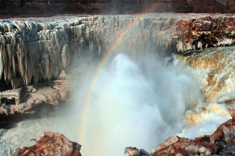 最佳季節:4月-5月和9月-11月最佳。4-5月稱為“三月桃花汛”,9-11月叫做“壺口秋風”。這兩個時期,水大而穩,瀑布寬度可達千米左右。主瀑難以接近,但遠遠望去,煙波浩淼,威武雄壯。大浪卷著水泡,奔騰咆哮,以翻江倒海之勢,飛流而下。真是“水底有龍掀巨浪,岸旁無雨掛彩虹。”此情此景,實非筆墨所能形容。數九寒冬,壺口瀑布又換上了一派銀裝玉砌的景象,在那瑰麗的冰瀑面上,涌下清涼的河水,瀑布周圍的石壁上,掛滿了長短粗細不一的冰滴溜,配上河中翻滾的碧浪,更顯示出一幅北國特有的自然風光